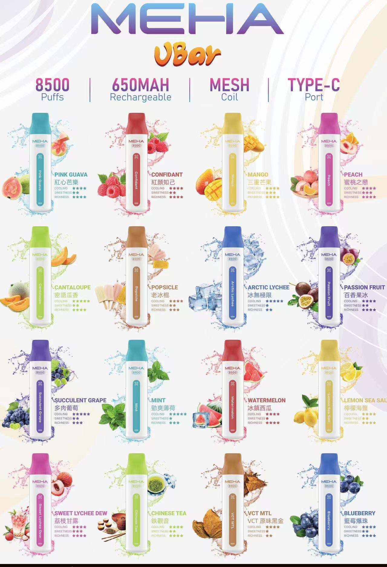 | 口味 | 三重芒果, 冰無極限, 冰鎮西瓜, 勁爽薄荷, 原味黑金, 多肉葡萄, 密語瓜香, 檸檬海鹽, 百香果冰, 紅心芭樂, 紅顔知己, 老冰棍, 荔枝甘露, 藍莓爆珠, 蜜桃之戀, 鐵觀音 |