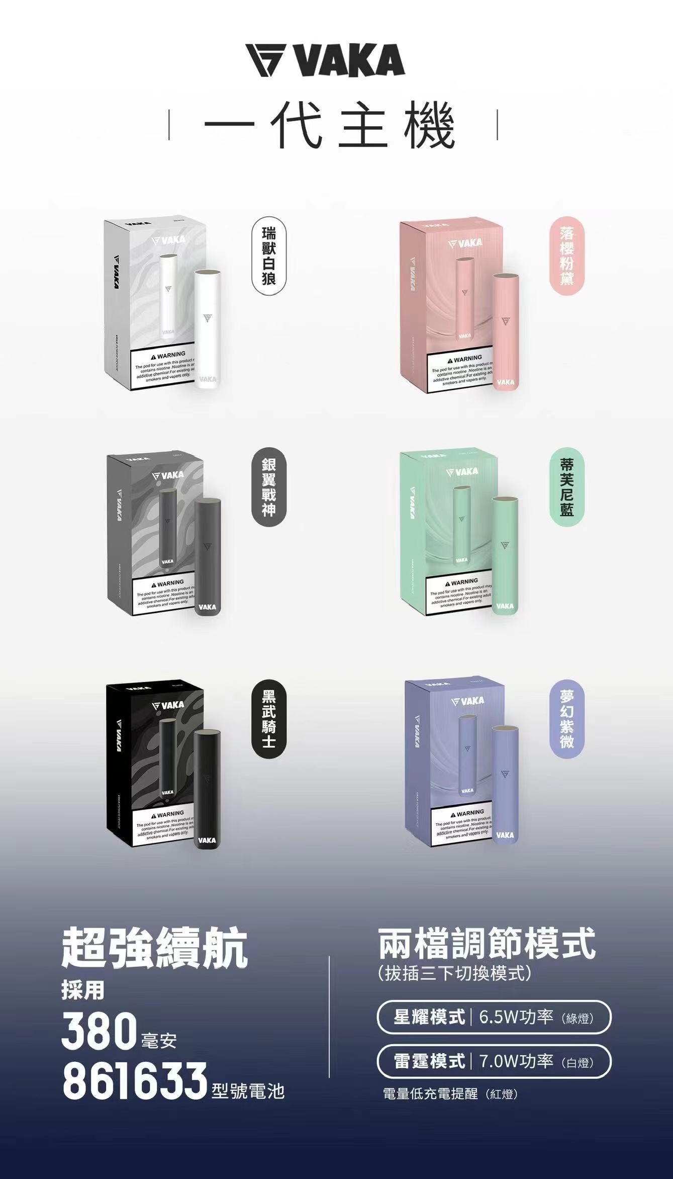 探索個性化吸煙體驗,選擇VAKA一代通用主機。這款主機適用於知名電子煙品牌IAIL、殺小、SP2S、LANA、RELX等,配備兩個檔調節模式,6.5W強大功率和380毫安優越電池容量。此外,提供6種引人注目的顏色,讓您的吸煙體驗更加豐富多彩。